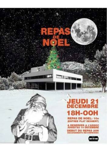 Coucou les p’tits potes! Le repas de Nöel fait son grand retour chez les archis et cela dans notre nouvelle école qui se met aux couleurs de Noël pour l’occasion. Venez festoyer avec nous le jeudi 21 décembre 2017 au 1 avenue Boffrand de 18h à 00h.