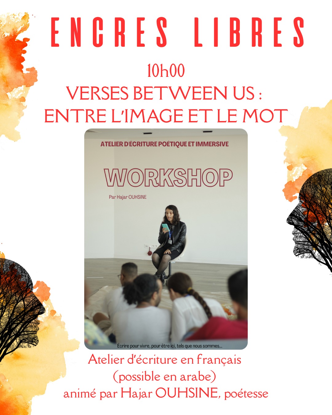 10h00 à 12h00 : Verses between us : entre l’image et le mot // Atelier d’écriture en français et possible en arabe, animé par Hajar OUHSINE, poétesse