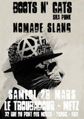 Boots n’ cats est un groupe lorrain comprenant 6 membres. Ce groupe de ska mêle différentes influences du genre tel que Los tres puntos, The specials, the skatalites, la ruda, mêlés à du punk français. Ce style restant très festif, c’est avec énergie que nos six joyeux lurons expriment sur la scène de la bonne humeur, de la joie de vivre et surtout une très forte envie de skanker !