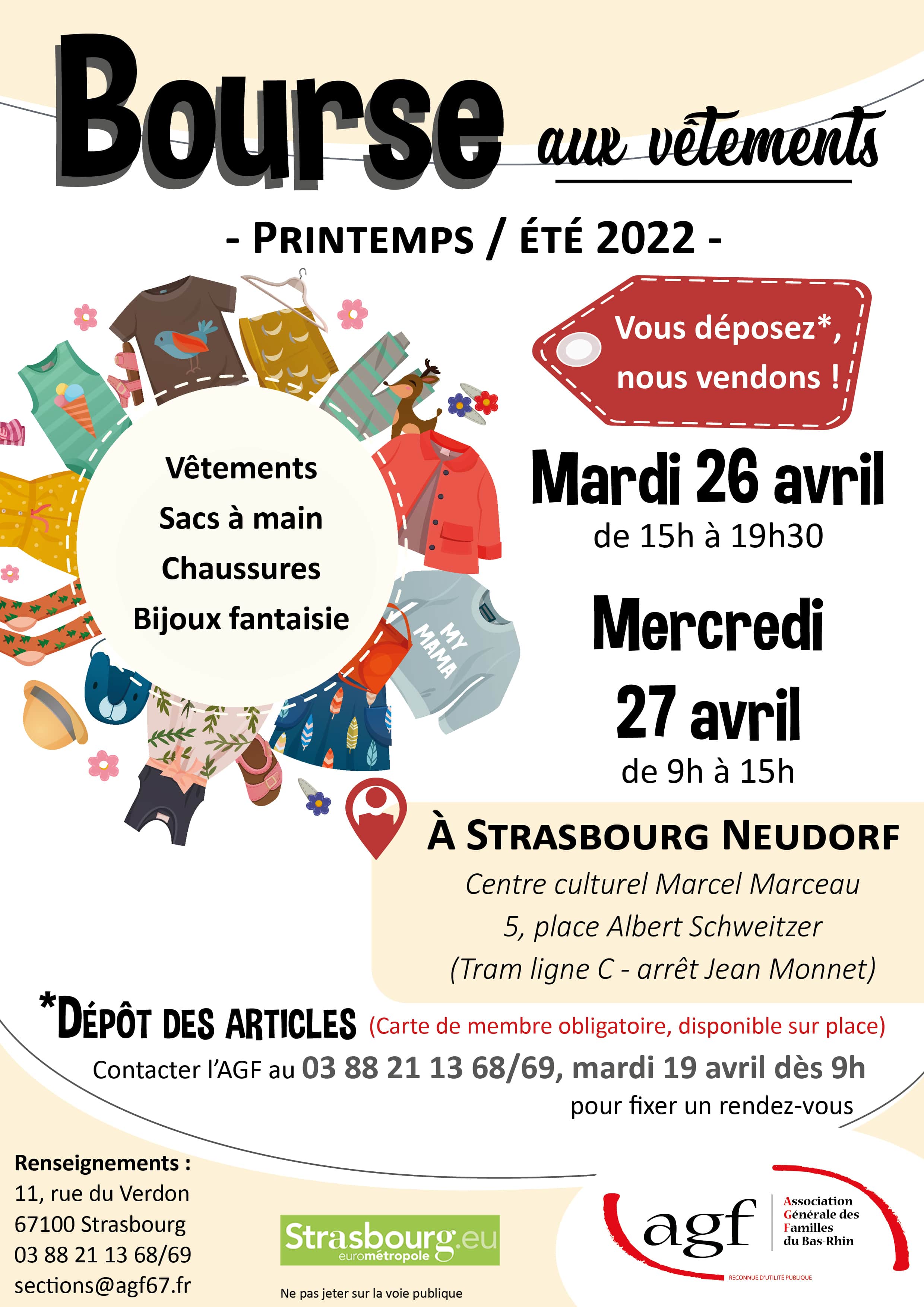 Dépôt des articles (vêtements, sacs à main, chaussures, bijoux fantaisie). Carte de membre obligatoire pour le dépôt uniquement, disponible sur place. Prendre rendez-vous par téléphone au 03 88 21 13 68/69 mardi 19 avril dès 9h pour fixer un rendez-vous pour lundi 25 avril (journée) et mardi 26 avril 2022 (matin).