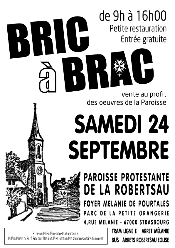 La Paroisse Protestante de la Robertsau organise son traditionnel bric-à-brac, au profit des oeuvres de la Paroisse, ce samedi 24 septembre. Comme à l'accoutumée, la vente se déroule au Foyer Mélanie de Pourtalès de 9h à 16 heures. Le foyer se situe dans le Parc de la Petite Orangerie à la Robertsau, à coté de l'Eglise Protestante.