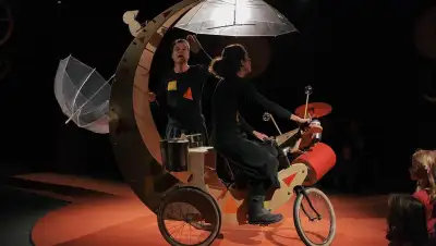Les deux personnages du spectacle déambulent dans un espace scénique circulaire qui représente leur espace de jeu et qui nous évoque tantôt une chambre d’enfant, une cour de récréation ou la piste d’un cirque. Ils disparaissent par moments dans un espace secret, donnent l’impression de ramener d’un grenier mystérieux leurs trésors cachés et s’émerveillent sous nos yeux de leurs trouvailles : un orgue à bottes, un souffle-bouteille, un vélo percussif, un harmonica de verre, une famille de piverts qui joue du bec en cadence…