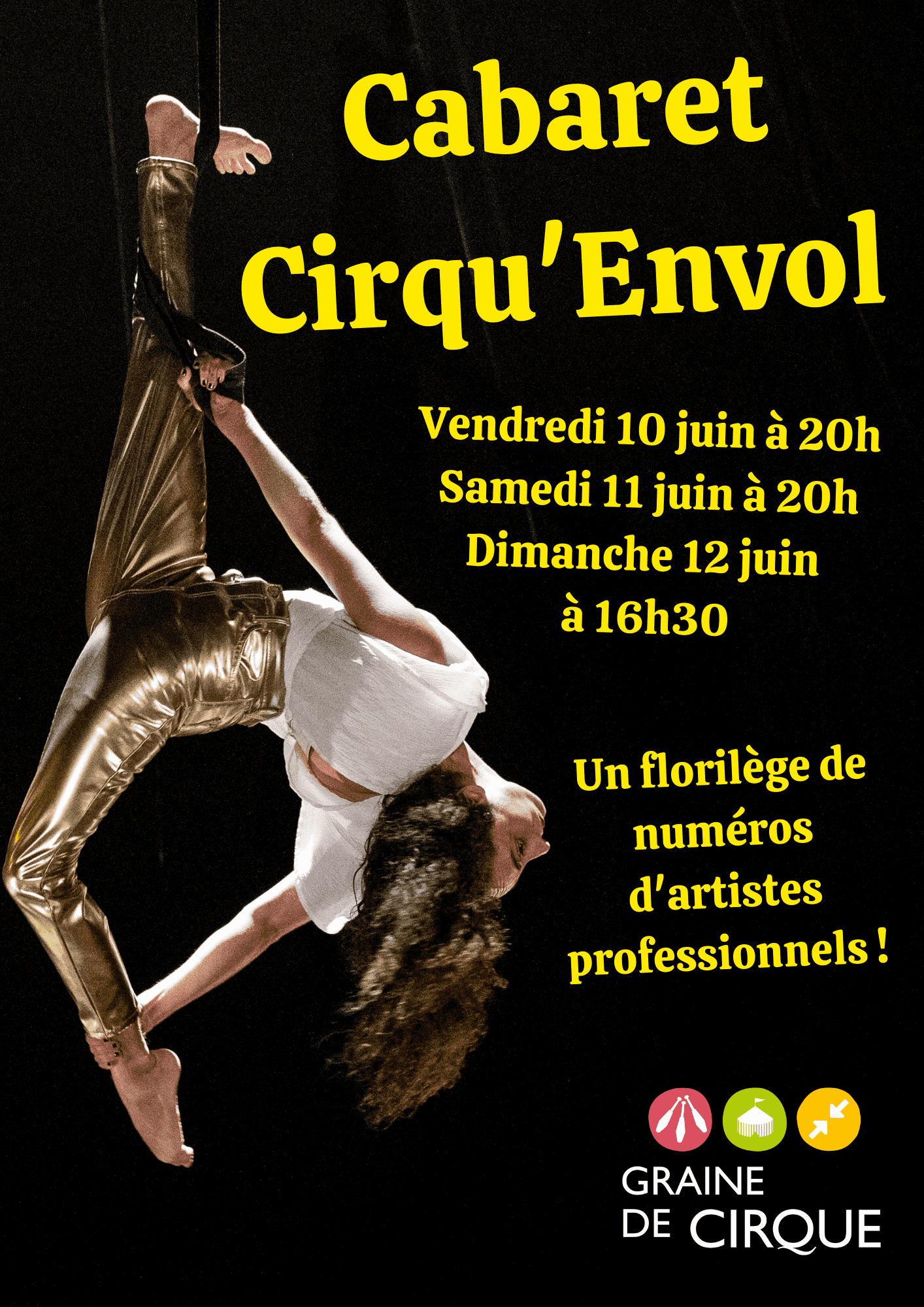 Comme chaque année, Graine de Cirque organise son traditionnel Cabaret Cirqu'Envol pour marquer le début de l'été. A cette occasion de nombreux artistes professionnels, venus de France et de l'étranger se produiront pour vous offrir un florilège de numéros alliant technicité, humour et poésie. Au programme ? Jonglaglerie, acrobatie, équilibre et aérien... Il y en aura pour tous les goûts !