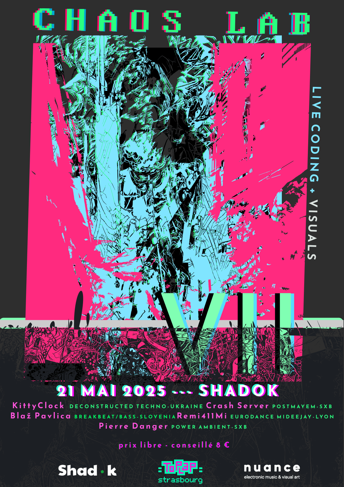 CHAOS LAB VII est la septième édition de notre série d’événements phares dédiés au live coding et à l’art génératif. Cette soirée exceptionnelle réunit artistes locaux et internationaux pour des performances où le code devient instrument, où l’algorithme devient expression artistique.