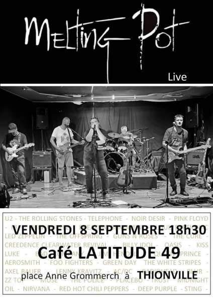 Dans le cadre du Programme Musical de l’Eté à Thionville Coeur de Ville, l’APECET (association des commerçants) et ses partenaires vous proposent différents concerts sur les places du Coeur de Ville. Vendredi 8 septembre ce sera "Melting Pot", au café LATITUDE 49.