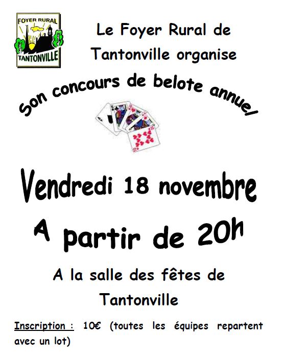 A noter dans vos agendas, vendredi 18 novembre à partir de 20h30 à la salle des fêtes de Tantonville le Concours annuel de belote du Foyer Rural de Tantonville !