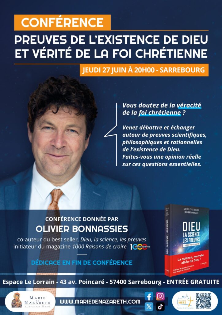 Cette conférence, intitulée « Preuves de l’existence de Dieu et vérité de la foi chrétienne » : sera menée par Olivier Bonnassies, co-auteur du best-seller Dieu, la science, les preuves, à l’initiative du Service de la Formation du Diocèse de Metz.