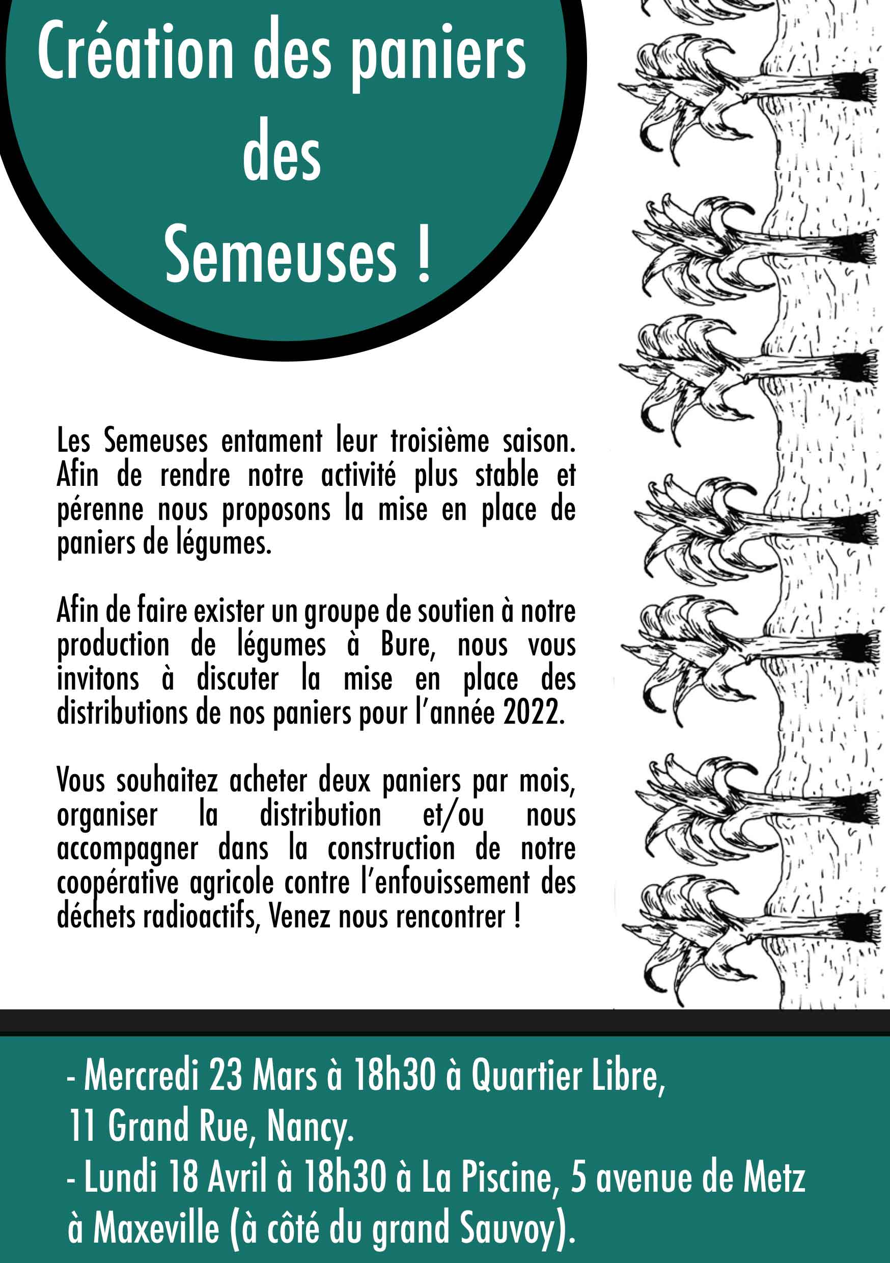Afin de faire exister un groupe de soutien à notre production de légumes à Bure, nous vous invitons à discuter la mise en place des distributions de nos paniers pour l’année 2022.