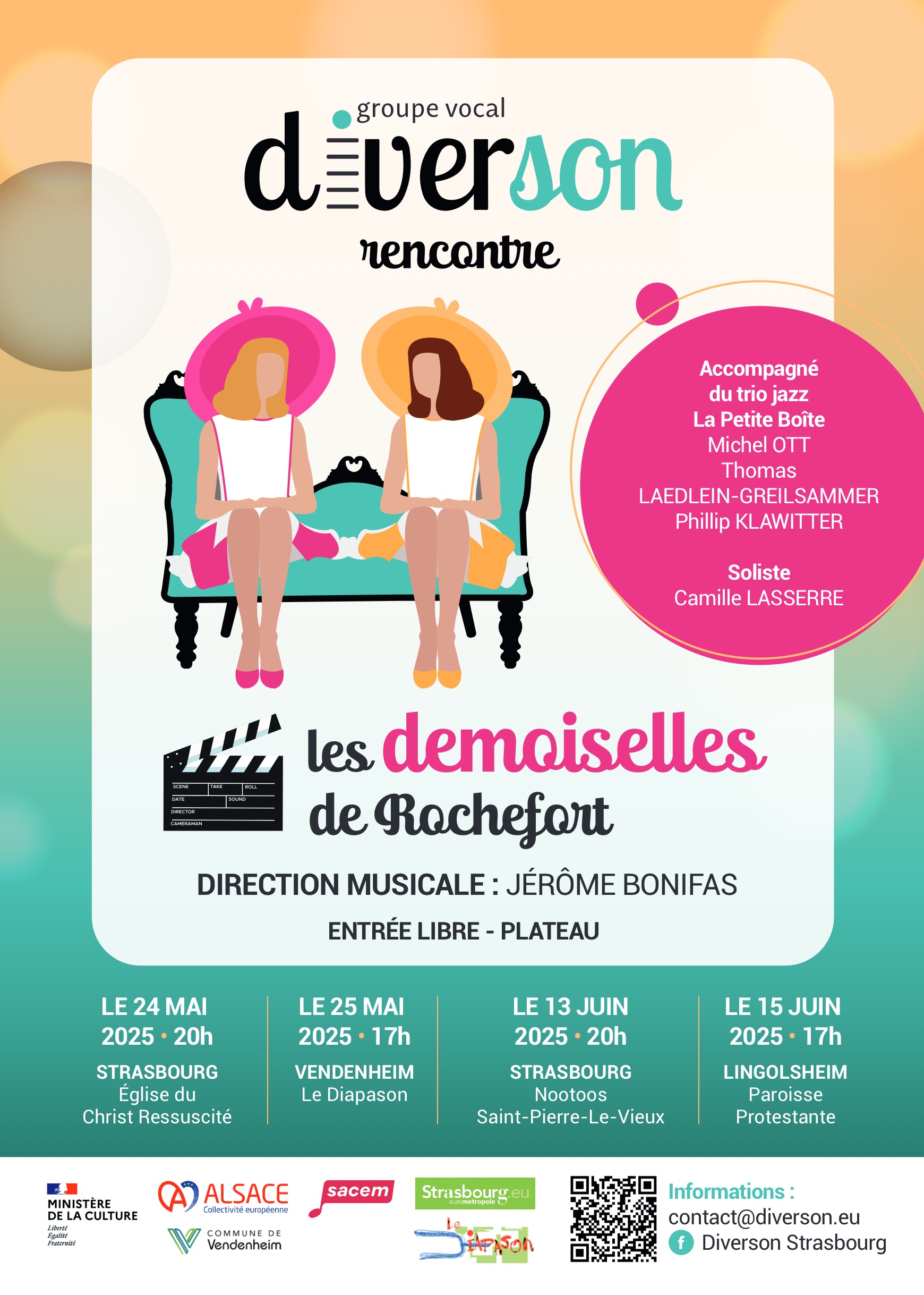 Accompagné des talentueux musiciens du trio jazz professionnel La Petite Boîte (Michel Ott, Thomas Laedlein-Greilshammer, Phillip Klawitter), et de leur soliste Camille Lasserre, l’ensemble Diverson vous embarque à Rochefort le temps d’une soirée chantée et mise en mouvement.