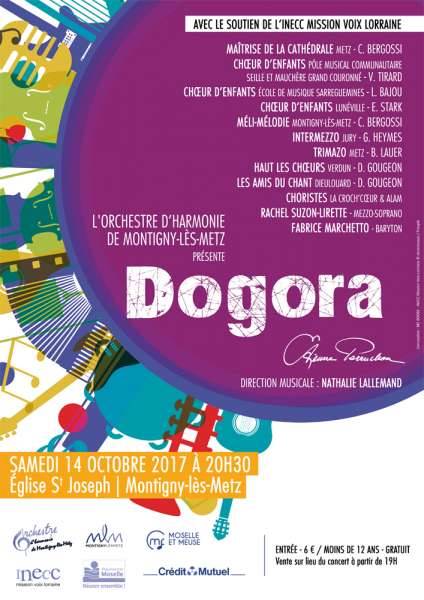 L’Orchestre d’Harmonie de Montigny-lès-Metz présente "Dogora" d’Etienne Perruchon, réalisé avec le soutien de l’INECC Mission Voix Lorraine. Ce concert réunira 1 orchestre, 4 chorales d’enfants, 5 chorales adultes et 2 solistes, soit plus de 200 participants. Avec les chorales Méli-Mélodie de Montigny-lès-Metz, Trimazo de Metz, Intermezzo de Jury, Haut les Choeurs de Verdun, Les amis du chant de Dieulouard, la Maîtrise de la Cathédrale de Metz, les Choeurs d’enfants des écoles de musique de Sarreguemines, de Nomény et de Lunéville. Solistes : Rachel Suzon-Lirette & Fabrice Marchetto. Direction musicale : Nathalie Lallemand