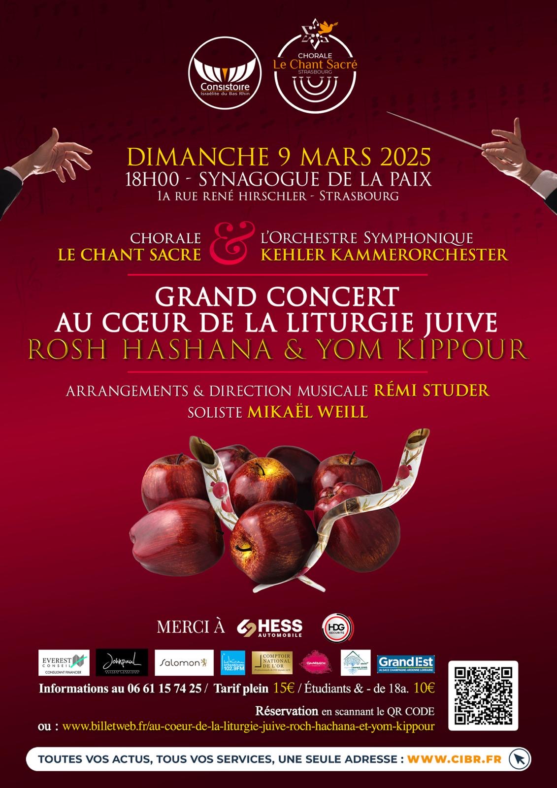 Habituellement a capella et occasionnellement accompagnée d’un orgue, c’est une occasion unique de découvrir ou redécouvrir les grandes pièces interprétées lors des fêtes de Roch Hashana (Nouvel an juif) et Yom Kippour (Grand pardon) à travers une orchestration réalisée spécialement pour cette occasion.