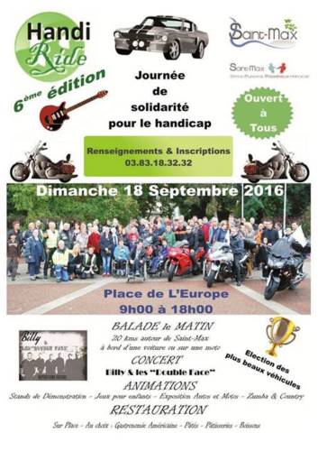 Handi Ride propose aux personnes handicapées une balade gratuite en motos et voitures de collection dimanche 18 septembre 2016 ; et l’après-midi, concerts, animations et restauration sur la place de l’Europe !