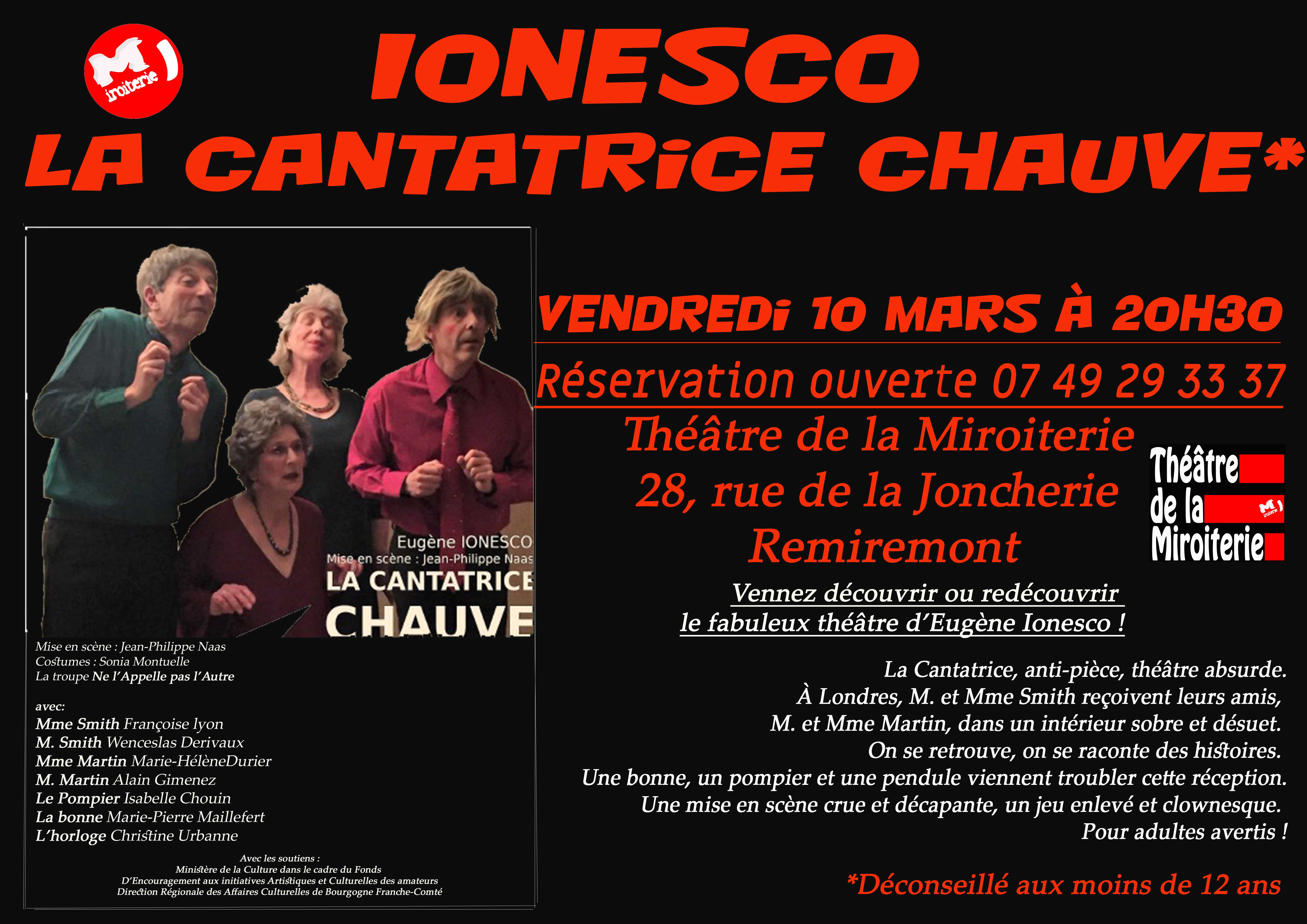 Anti-pièce, Théâre de l'absurde mais véritable théâtre du répertoire. Eugène Ionesco dans une de ses plus puissantes création, servie dans le Théâtre de poche de Remiremont.... Un vrai régal ! Réservation : 07 49 29 33 37