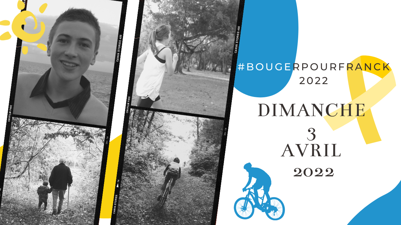 Cette année, en attendant avril 2023 avec une version plus traditionnelle de notre Marche Solidaire, l'Association "Franck, un Rayon de Soleil" vous propose de participer à notre événement dématérialisé #bougerpourfranck2022 le Dimanche 3 avril 2022 ! Où que vous soyez en France ou dans le monde, le départ se fait de chez vous ! En toute liberté ou à travers nos challenges, nous comptons sur vous alors inscrivez-vous en solo ou à plusieurs ! ;) Ensemble, agissons pour nos Rayons de Soleil !