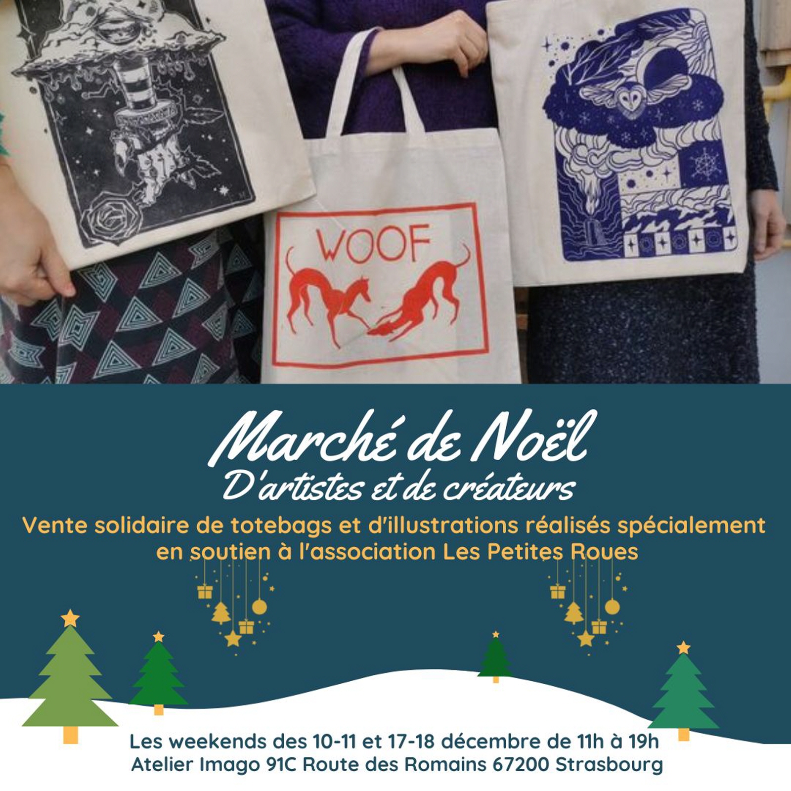 Vous pourrez venir shopper ces créations les week-ends des 10 & 11 et 17 & 18 décembre 2022 au marché de Noël de l'atelier dans le Parc Gruber ! Des membres de l'association Les Petites Roues seront présents pour échanger avec vous autour des actions de l'association et pour vous offrir un bon vin chaud. L'association Les Petites Roues organise des maraudes pour les personnes sans-abri à Strasbourg. À vélo, l'association distribuent des kits repas, des produits d’hygiène, de puériculture, des vêtements, avec un accompagnement administratif et psychologique.