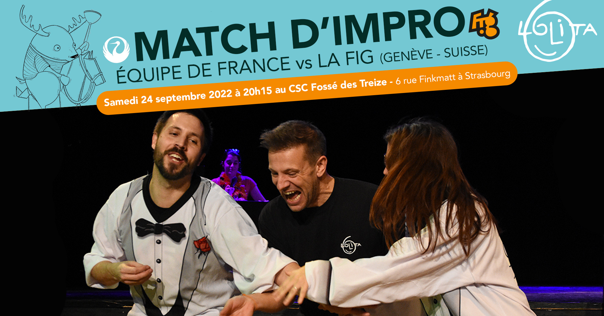 C’est reparti pour une saison de théâtre d’impro avec la Lolita au CSC Fossé des Treize! Pour inaugurer cette saison 2022-2023 avec panache, nous accueillons l’équipe Suisse de la FIG de Genève qui fera face à l’équipe de France de la Lolita pour un match d’impro au sommet!