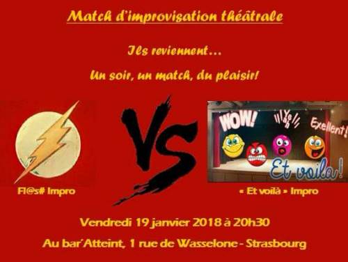 Le vendredi 19 janvier 2018 à 20h30, le Bar’atteint sera le théâtre d’un match improvisé ultime entre la bande de ’Fl@s# Impro’ et leurs copains du ’et voilà impro’ (Gentils Improvisateurs du PréO).