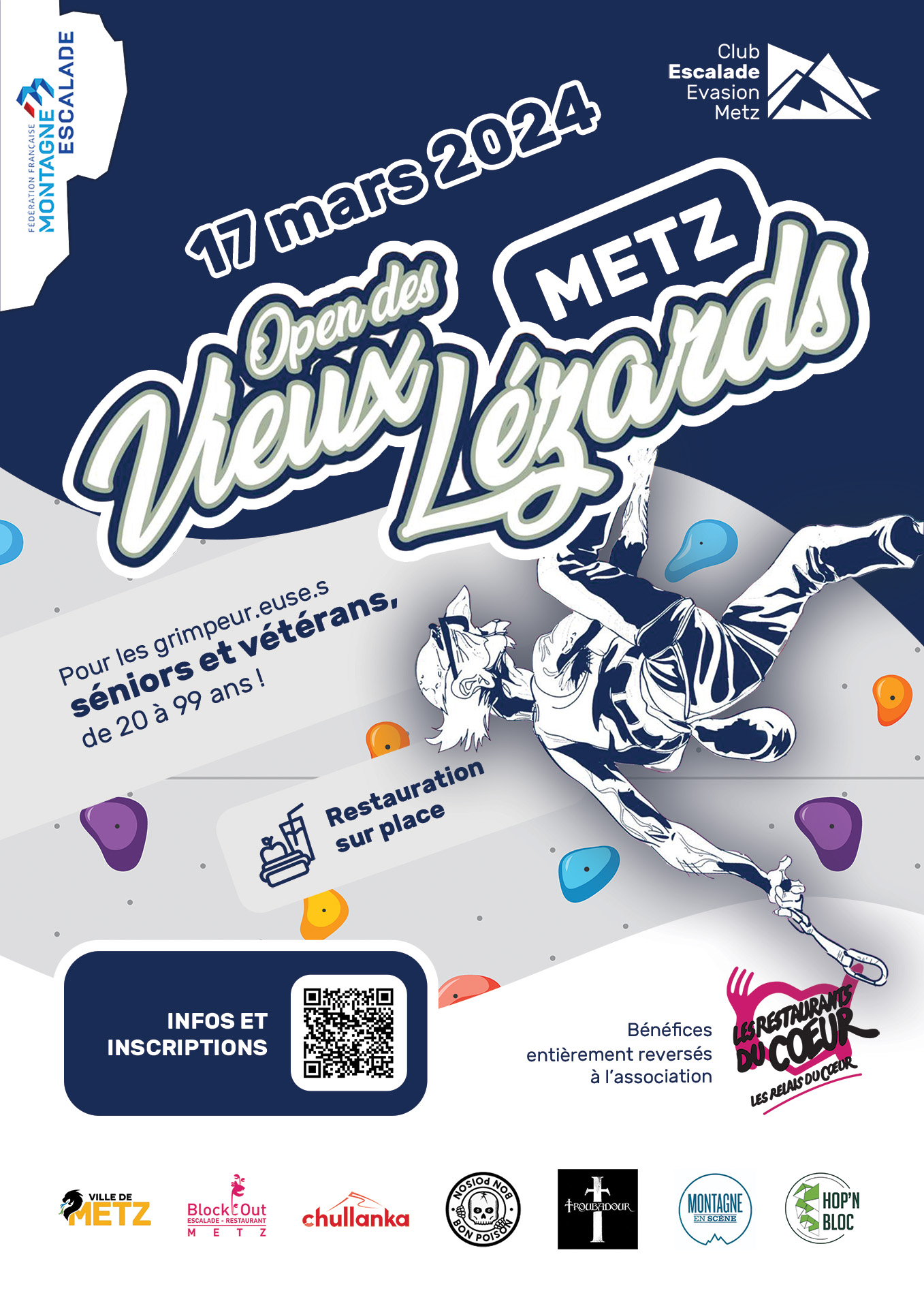Le circuit des vieux lézards fait étape à Metz ! Cette compétition amicale met avant tout le plaisir de grimper pour toutes et tous. C'est l’occasion de se retrouver lors de manifestations ouvertes, simples conviviales et ludiques, tant pour les organisateurs que pour les grimpeuses et grimpeurs. Il permet pour les clubs, pour les grimpeuses, grimpeurs et bénévoles d’échanger et de connaître entre autres de nouvelles salles d'escalade.