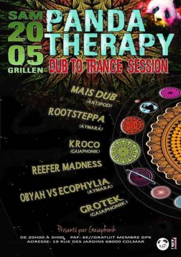 Gaïaphonik est heureux de t’annoncer le retour de la PANDA THERAPY au grillen, cette fois ci pour une édition dub & trance avec un plateau d’artistes de chez Antipod Records, Aymara et encore quelques copains bien motivés !