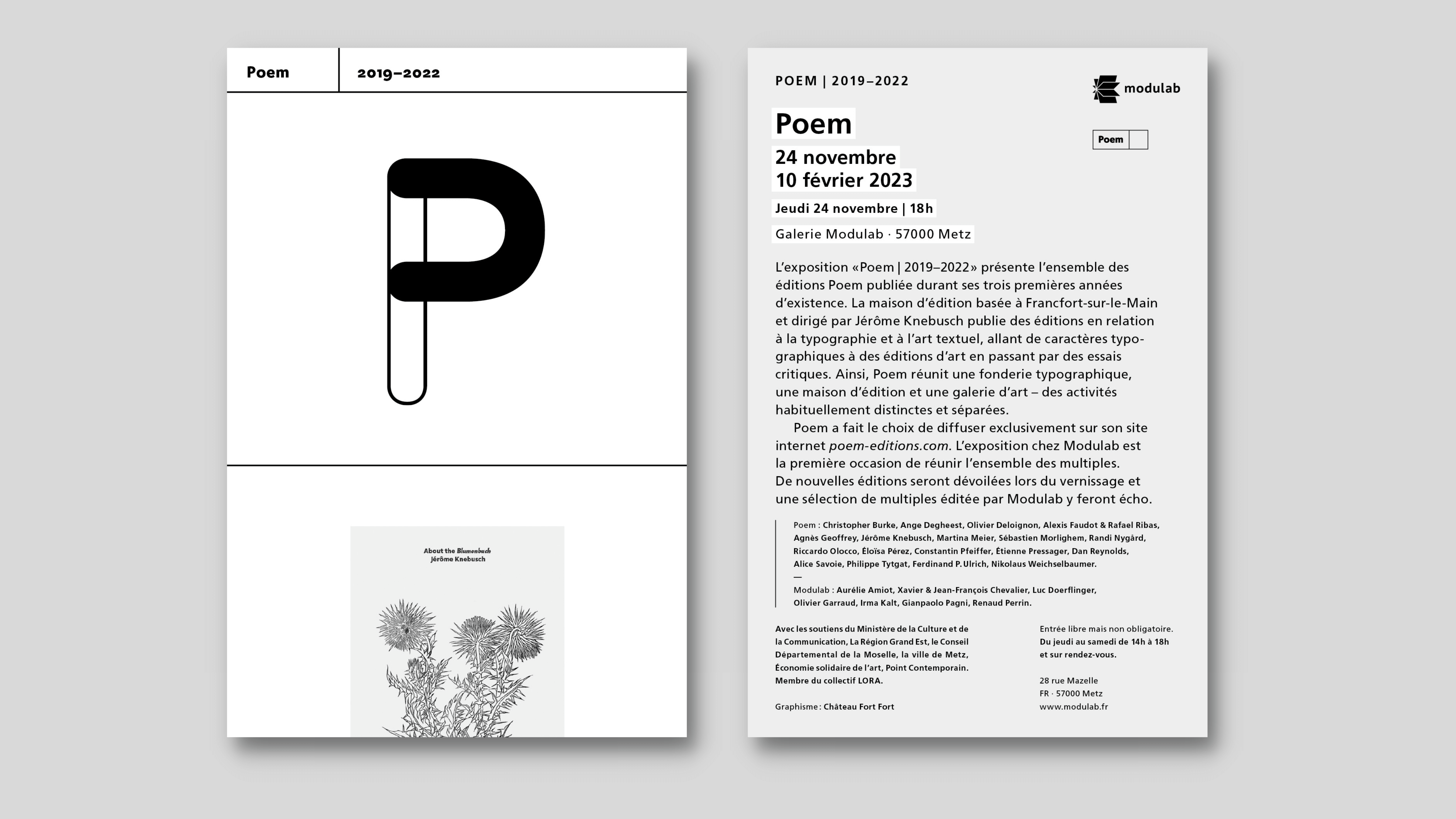 L’exposition « Poem | 2019-2022 » présente l’ensemble des éditions Poem publiée durant ses trois premières années d’existence. La maison d’édition basée à Francfort-sur-le-Main et dirigé par Jérôme Knebusch publie des éditions en relation à la typographie et à l’art textuel, allant de caractères typographiques à des éditions d’art en passant par des essais critiques. Ainsi, Poem réunit une fonderie typographique, une maison d’édition et une galerie d’art – des activités habituellement distinctes et séparées. Poem a fait le choix de diffuser exclusivement sur son site internet poem-editions.com. L’exposition chez Modulab est la première occasion de réunir l’ensemble des multiples. De nouvelles éditions seront dévoilées lors du vernissage et une sélection de multiples éditée par
