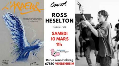 Ross Heselton, né au Royaume-Uni et vivant en France depuis 2002, est poète, musicien et traducteur. Ancré dans la poésie et le blues, et armé de sa voix, sa guitare et de ses ghunghuru (bracelets-grelots d’origine indienne portés aux chevilles qui résonnent au rythme des pas), il creuse une forme de chanson primitiviste aux temps longs et à l’instrumentation dépouillée, dont l’oralité est la clef : ritournelles, chants, poèmes, histoires et incantations, où la guitare laisse la place à la voix et aux mots, qui laissent la place au corps, qui danse, qui parle, qui incarne, et qui à son tour laisse place au silence, à l’espace, au temps, aux chansons qui sont elles mêmes des forces vivantes.