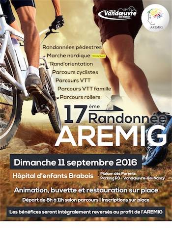 ce dimanche a Lieux la 17 randonnée de l’AREMIG sur le parking de l’hôpital pour enfants de brabois avec des spectacles à partir de 12h00 dont un spectacle d’escrime ancienne avec les bretteurs costumés du cercle d’escrime de vandoeuvre