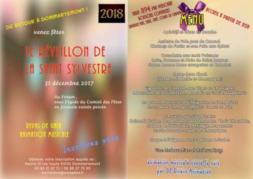 Inscrivez vousà la soirée de la Saint Sylvestre au Forum de Dommartemont le 31 décembre. Repas de gala et animation musicale de 19H30 à l’aube.