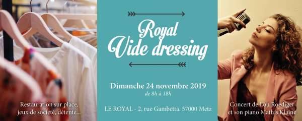 Il semblerait que le Royal à eu la bonne idée de créer un vide dressing d’automne, en intérieur et en plein centre ville. Au programme, ventes de vêtements, bijoux, accessoires et petits objets, ambiance jazzy, toute la journée, rehaussé par un concert de Lou Roediger et son piano Mathis Klaine (Jazz).
