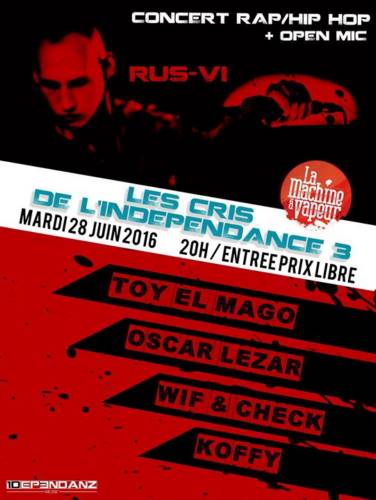 Il y a 1 an, j’organisais mon 1er concert Les Cris De L’Indépendance pour la sortie de mon deuxième album. Il y a ensuite eu la 2ème édition avec Kalash L’Afro comme tête d’affiche, en novembre dernier. Et comme on dit, jamais 2 sans 3... On vous donne donc RDV le Mardi 28 Juin à partir de 20h à La Machine A Vapeur pour un nouveau concert ! Vous pourrez retrouver cette fois des collègues du secteur, à savoir Toy El Mago, Koffy, Wif & Check, Oscar Lezar, DJ ZR et moi-même. L’entrée sera à prix libre (vous mettez le montant que vous voulez) et il y aura comme d’habitude un Open Mic pour ceux qui voudront kicker. On vous attends nombreux pour foutre un bordel !! Big up à ceux qui viendront nous donner la force !!