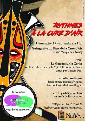 Dimanche 17 septembre à 15h,venez sous les arbres du Parc de la Cure d’Air, rue Marquette à Nancy, vous laisser gagner par les rythmes du groupe Folimandingue, et de l’orchestre des jeunes de la MJC Saint-Epvre-Lillebonne (le Gâteau sur la Cerise).
