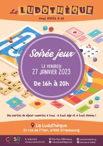 Rendez-vous à la cinquième soirée jeux de la Ludo’ : animation, convivialité et plaisir seront au rendez-vous autour de jeux de société pour finir la semaine dans une ambiance ludique ! En famille, entre jeunes, à tout âge, seul ou à plusieurs, cet instant inédit est ouvert à tous et à tous les niveaux, débutant ou confirmé, guidé par l’expérience des ludothécaires qui seront présents sur place.  Ce moment de rencontre et de partage entre adhérents, habitants et habitués du quartier du Conseil des XV se déroulera le vendredi 27 janvier 2023 de 16h à 20h, à la Ludothèque au 24 rue de l’Yser à Strasbourg.