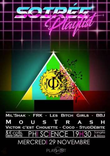 La PlayList organise une merveilleuse soirée à Phi, juste à côté de Télécom. La soirée commence à 18h mais les plus déterminés pourront nous y retrouver dès 16h30. Des départs seront organisés à l’école pour ceux qui ne savent pas où se trouve Phi-Sciences.