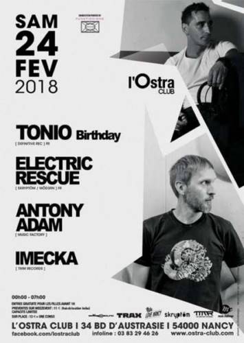 Le 24 Février TONIO fête son birthday à L’Ostra Club et invite ELECTRIC RESCUE boss du label Skryptöm , ANTONY ADAM, IMECKA