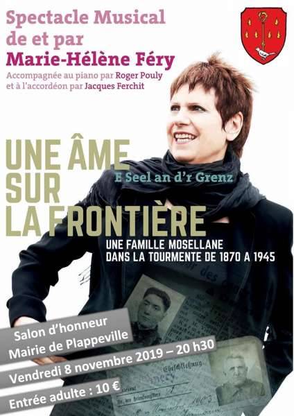 Le spectacle « Une âme sur la frontière » s’articule autour des origines mosellanes de l’artiste et du récit d’événements vécus par sa famille au travers des guerres (1870 /14-18 /39-45). Les frontières, l’identité, l’exil... seront évoqués parmi les témoignages restitués sous forme de récits et chansons, créés pour le spectacle ou existants, empruntés à chaque époque.
