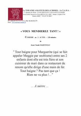 Le Théâtre Amateur Des Auboris (Le T.A.D.A, 17 Chemin de Metz, 57640 Servigny-Lès-Ste-Barbe) vous propose «VOUS MENDIEREZ TANT !» de Jean-Claude MARTINEAU, une comédie en 3 actes, avec un entracte.