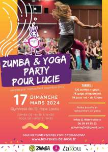 Valérie PETIT, professeur certifiée, animera de la zumba le dimanche 17 mars de 14h30 à 16h30 et du yoga de 16h30 à 17h30 au gymnase de l'Europe à Laxou provinces. Les bénéfices de cette zumba/yoga party seront reversés à l'association Les rêves de Lucie.