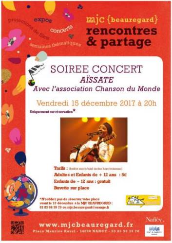 Pour la semaine du "Droit de l’Humain", la MJC Beauregard en partenariat avec l’Association Chanson du Monde, propose une soirée concert avec AÏSSATE le Vendredi 15/12/17 à partir de 20 heures à la MJC Beauregard.