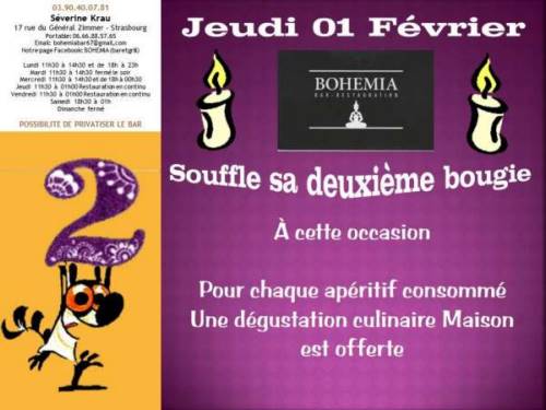 Jeudi 01/02 le BOHEMIA fête son 2eme ANNIVERSAIRE donc pour l’occasion le groupe TransVersal sera de la partie; le concert débutera à 21h.