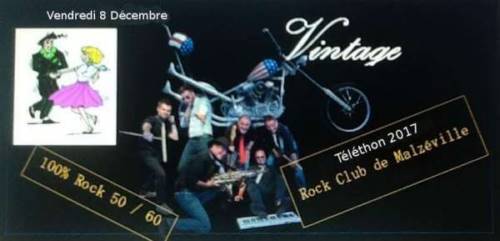 Grande soirée Rock and Roll avec le groupe VINTAGE Rock des années 50. Organisé par le Rock Club de Malzéville avec le concours de Vitalliance au profit du téléthon 2017.
