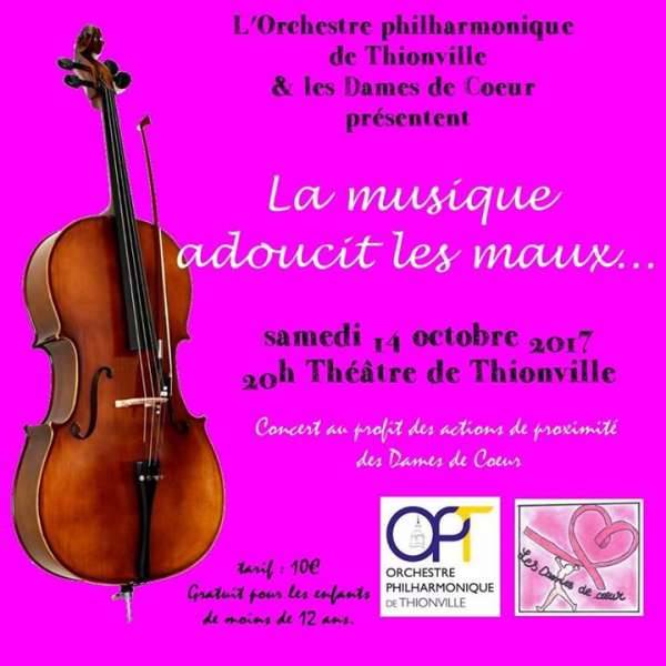 Le samedi 14 octobre, à 20H au Théâtre municipal de Thionville, l’orchestre philharmonique de Thionville fera un concert au profit de l’Association les Dames de Coeur : La musique adoucit les maux