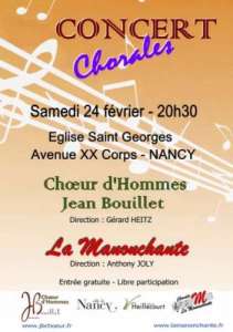 Le chœur mixte La Manonchante, sous la direction d’Anthony Joly, et le Chœur d’Hommes Jean Bouillet, sous la direction de Gérard Heitz, vous proposent un concert à l’église néoclassique Saint-Georges de Nancy.