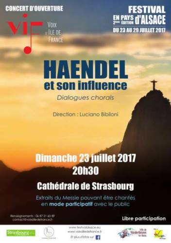 Le Coeur "Les VIF" proposent le concert d’ouverture du Festival en Pays d’Alsace, sur le thème "Haendel et son influence, dialogues chorals". Des extraits du Messie alterneront avec des œuvres montrant une influence musicologique ou thématique directe avec l’œuvre emblématique de Haendel, ainsi que des pièces écrites par des compositeurs qu’il a fortement influencé, au premier rang desquels Mozart et son Requiem.