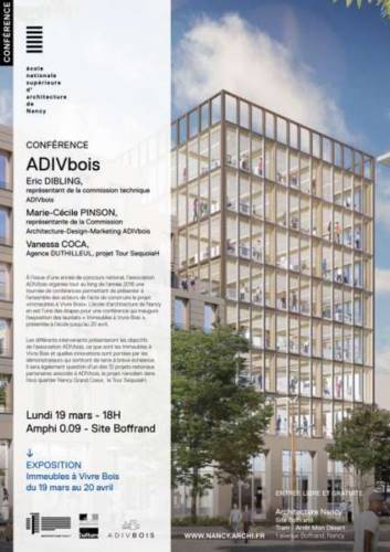 À l’issue d’une année de concours national, l’association ADIVbois organise tout au long de l’année 2018 une tournée de conférences permettant de présenter à l’ensemble des acteurs de l’acte de construire le projet ‘Immeubles à Vivre Bois’. L’école d’architecture de Nancy en est l’une des étapes pour une conférence qui inaugure l’exposition des lauréats « Immeubles à Vivre Bois », présentée à l’école jusqu’au 20 avril.