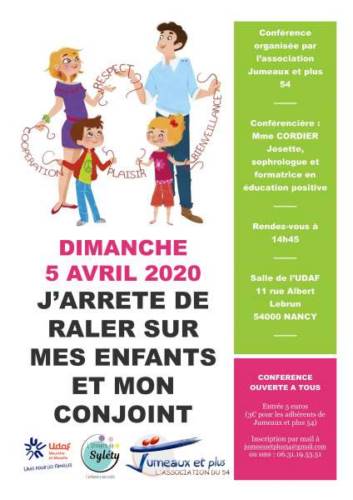 L association Jumeaux et plus organise une conférence sur le thème j’arrête de râler sur mes enfants et mon conjoint. Conférence animée par Josette Cordier sophrologue et formatrice en éducation positive.