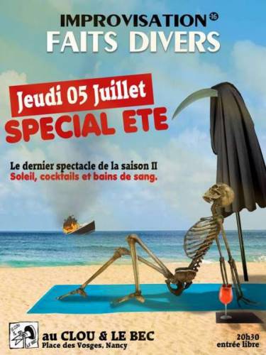 On invite tous ceux qui n’ont pas cette chance non plus de nous rejoindre au Clou & le Bec à Nancy, le 05 juillet à 20h30, pour le dernier spectacle de la saison II des FAITS DIVERS !