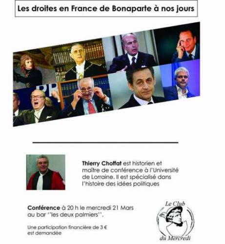 Le Club du Mercredi reçoit Thierry Choffat pour une conférence sur l’histoire de la Droite, et des droites, en France depuis Napoléon Bonaparte. Thierry Choffat nous présentera les différents courants de pensée qui animent la Droite, et évoquera les événements marqueurs de cette famille de pensée.