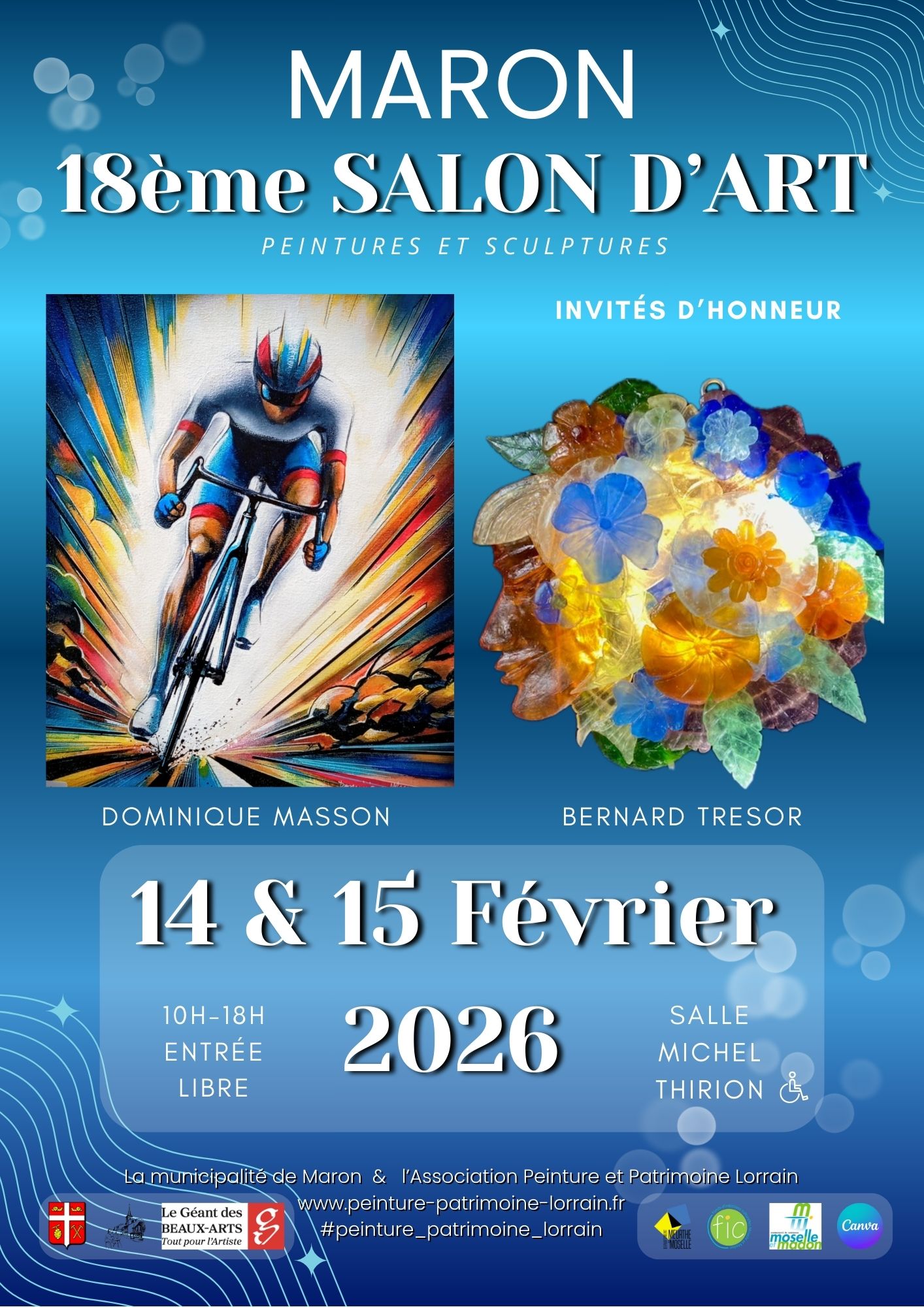 La municipalité de MARON et l’Association Peinture et Patrimoine Lorrain ont le plaisir de vous inviter au 18ème salon d’Art de MARON qui aura lieu à la Salle Michel TIRION les 14 et 15 février 2026. Nos invités d’honneur sont Dominique MASSON peintre et Bernard TRESOR sculpteur. Vous trouverez la liste des autres artistes sur notre site internet.