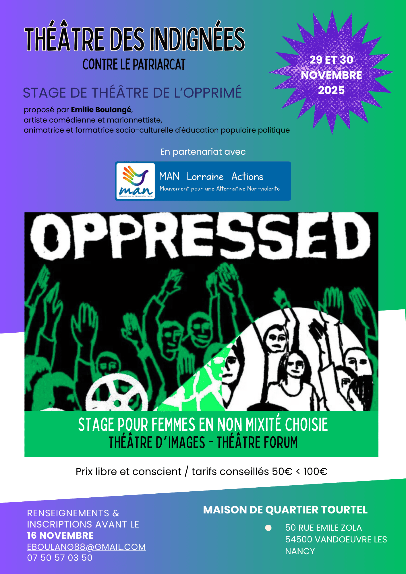 Le MAN co-organise avec Emilie Boulangé un weekend de découverte du théâtre de l’opprimé le samedi 29 et le dimanche 30 novembre 2025 sur le thème "indignées contre le patriarcat".