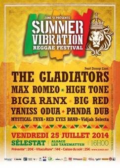 Pour sa première édition, le SUMMER VIBRATION accueillera notamment en tête d’affiche les mythiques Jamaïcains THE GLADIATORS qui seront accompagnés pour l’occasion du jeune talentueux DROOP LION. Autre figure emblématique des racines du reggae : MAX ROMEO et ses 50 ans de carrière, compositeur du tubesque « Chase the devil » à l’épreuve du temps… Le festival proposera également une véritable programmation ragga, grâce à la présence de BIG RED (fondateur emblématique de RAGGASONIC) et du jeune prodige français BIGA RANX, dont la maîtrise du dancefloor n’est plus à prouver.
