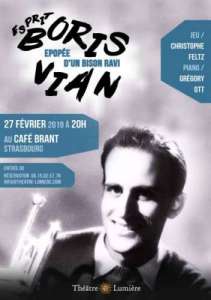 Pour ce 5e rdv de nos "Mercredis du Brant saison 5 et dans le cadre du 60e anniversaire de sa disparition (1959/2019), la compagnie Théâtre Lumière fouille et interroge l’œuvre extraordinaire de l’un des très grands esprits artistiques et poétiques du XXe siècle, Boris Vian. Notre « Bison ravi », comme il aimait à se faire appeler (anagramme de Boris Vian) est un artiste original et unique (auteur, poète, traducteur, chanteur, musicien...) qui a, entre autre chose, fait découvrir en France ses amis « rois du jazz » Duke Ellington, Charlie Parker, Miles Davis pour ne citer que les plus célèbres.